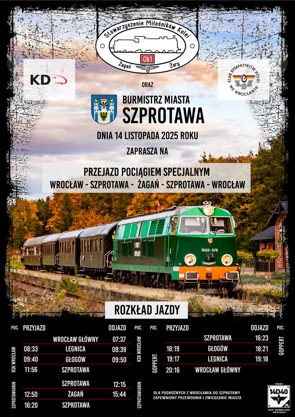 Przenieś się w klimat dawnych lat i wyrusz z nami w niezwykłą podróż turystycznym pociągiem retro z Wrocławia do Szprotawy! Wspólnie z Burmistrzem Miasta Szprotawa oraz Stowarzyszeniem Miłośników Kolei Ok1 z Żagania oraz spółką ALS zapraszamy na przejazd niecodziennym turystycznym pociągiem retro. Pociąg wyruszy z Wrocławia Głównego w kierunku Legnicy oraz Lubinia. Przejedziemy kawałkiem linii tzw. Nadodrzanki i dojedziemy do Głogowa. Szczególnym punktem wyprawy będzie przejazd malowniczym, niezelektryfikowanym odcinkiem linii kolejowej nr 14 – z Głogowa do Szprotawy – dzisiaj nie kursują po niej rozkładowe pociągi pasażerskie!